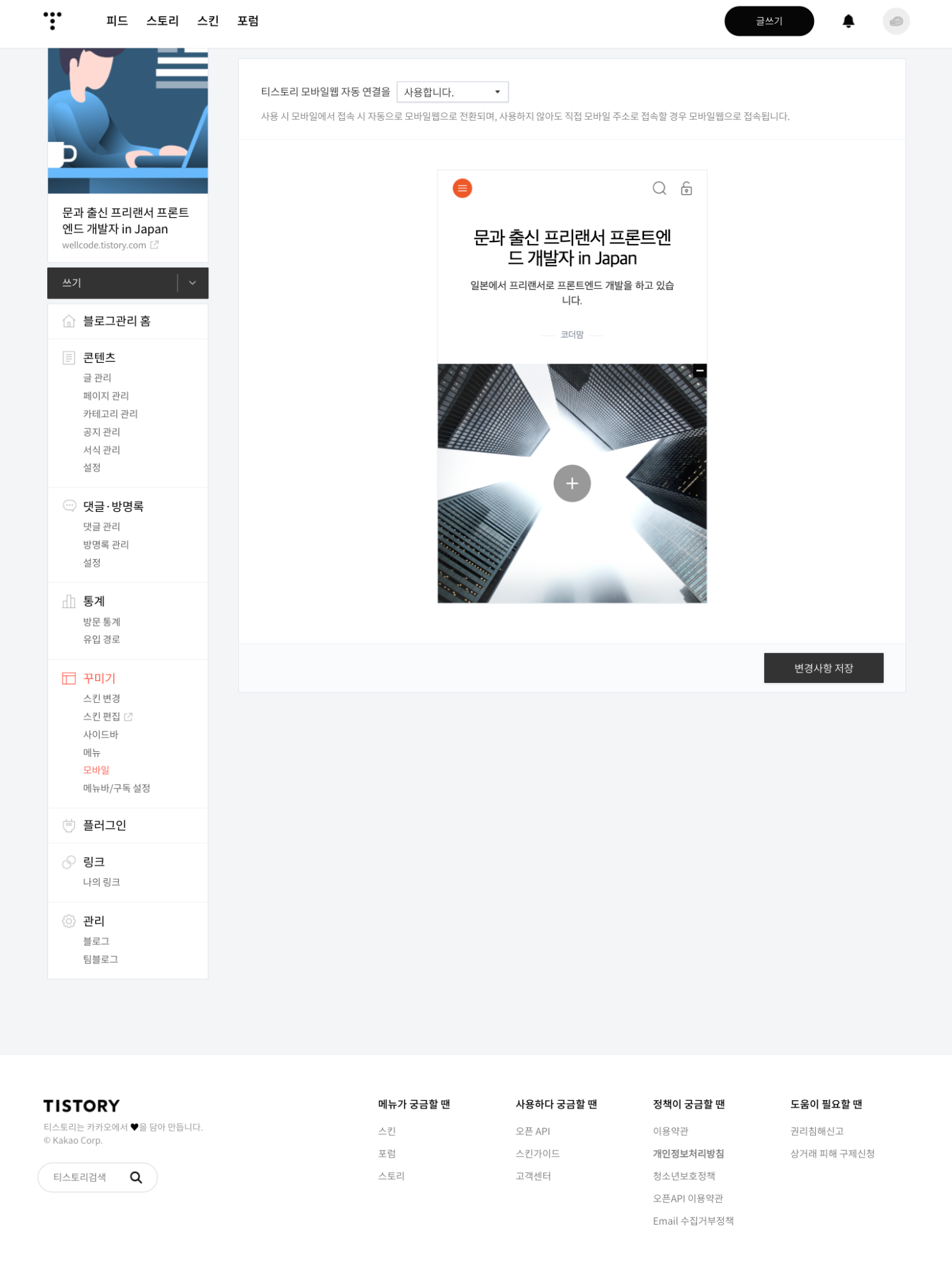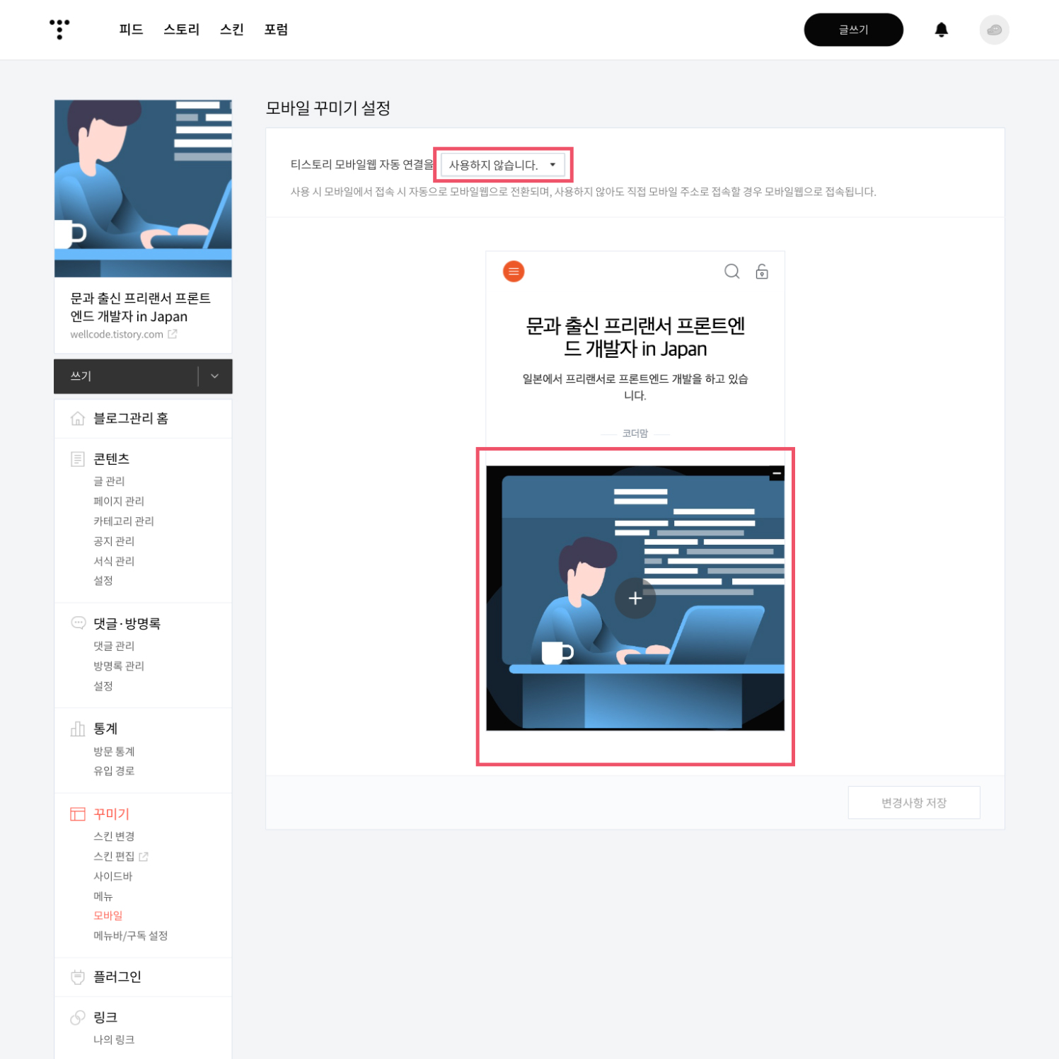 모바일 꾸미기 설정의 티스토리 모바일웹 자동 연결을 사용합니다. 와 모바일 첫 화면 이미지를 변경하지 않았던 점이 원인이었다.